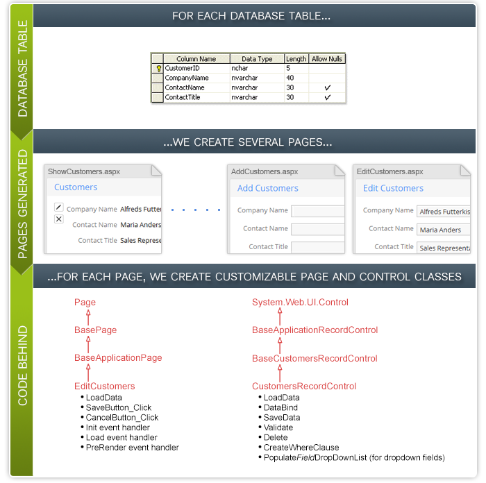 Iron Speed Designer generates sophisticated ASPX pages with database-connected forms, tables and reports.