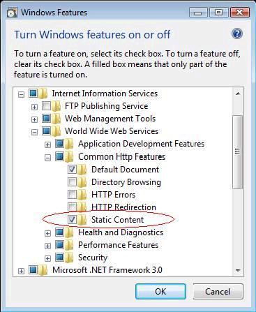 Step 5: Enable ‘Static Content’ in the World Wide Web Services section. This permits static