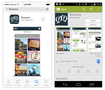 the Apple App Store (iOS) and Google Play (Android).