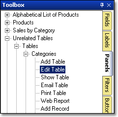 The toolbox contains the full set of databound panels, including 'unrelated' tables