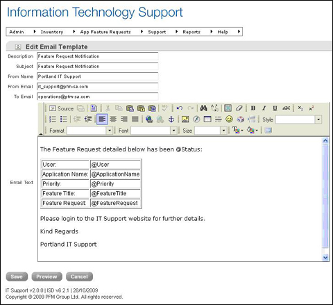is stored in the email template table and can be easily changed via an Iron Speed Designer edit record page.