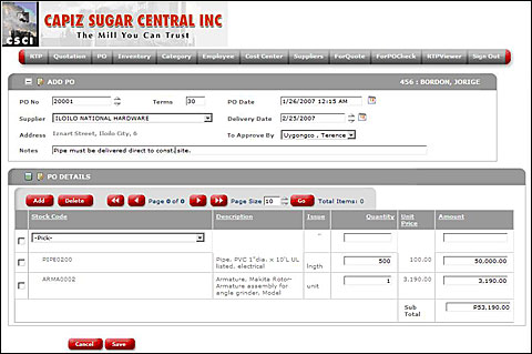 the Inventory master control. From there, the employee opens a new Request to Purchase and adds