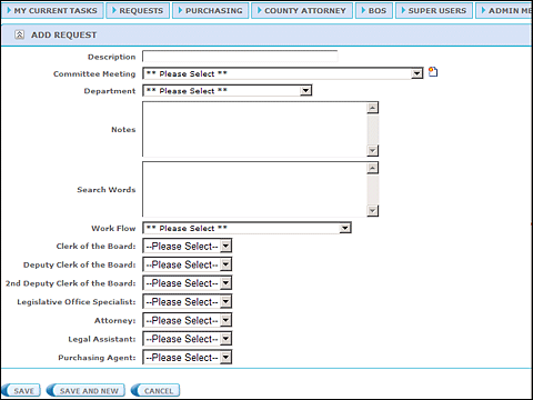 The Add Request Screen showing the Workflow Selection and the Assignment of the People