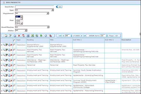 The Show BOS Products Table Page with no filter shows a history of 14,729 records that