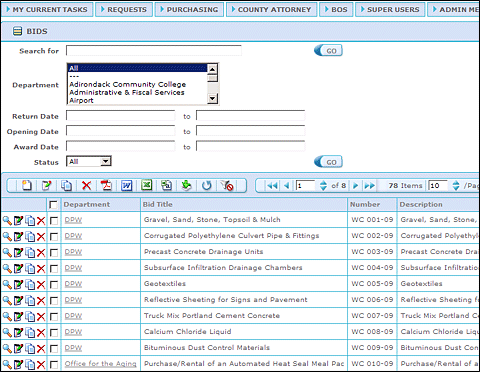 The Bid/Purchasing Module with filters for Department, Status, and various dates associated