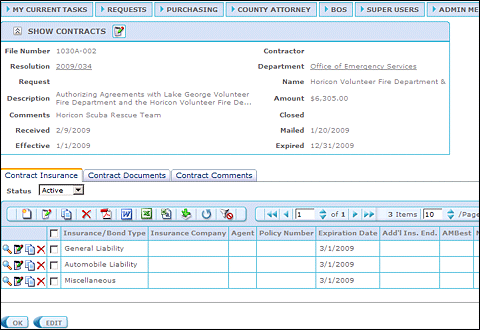 The Show Page for a particular Contract with child tables for Insurances and Expiration
