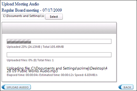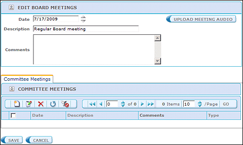 The Edit Board Meetings Screen with a button to upload the Audio File. This is