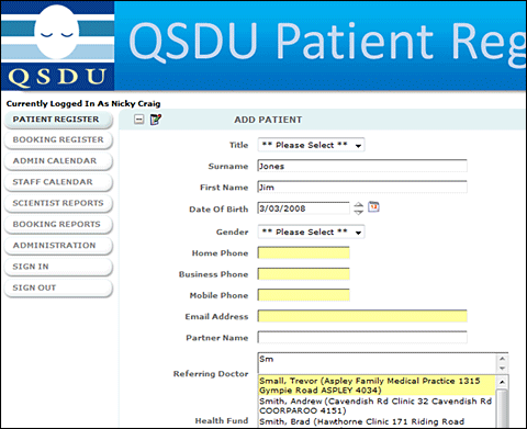 Queensland. The QSDU Patient Register is a port and extension on an existing application and