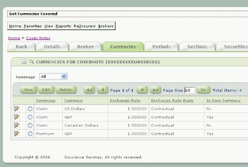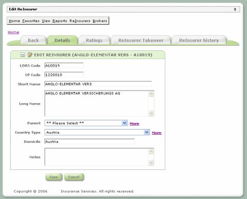 The application stores information on multiple reinsurers and their S & P and Amlin ratings.