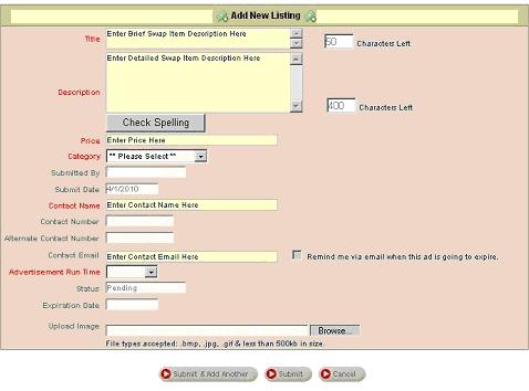 A user submitting new classified ads can upload images and schedule ad expiration dates. The user can request an email alert to